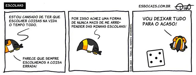 É típico do comportamento humano assumir um modo de ser desapercebido, muitas vezes cruel e desleal, a fim de evitar o desconforto da decisão. Isso, para alguns, chama-se autossabotagem; para mim, faz parte de uma construção pessoal e de um modo próprio de lidar com aquilo que frustra e incomoda. Ainda que frustre e incomode, conhecemos o lugar onde estamos e tendemos a pensar que ele não nos causa perigo.